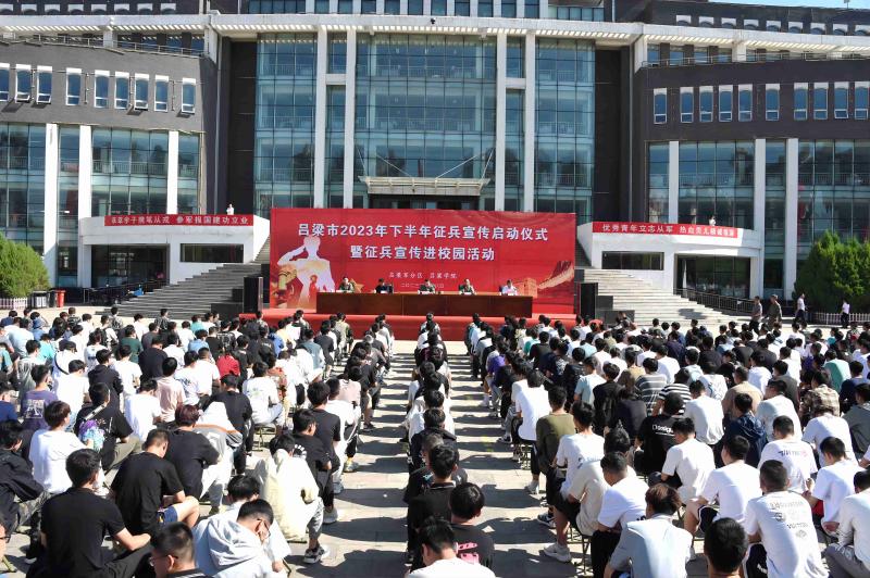 6月8日上午,吕梁市2023年下半年征兵宣传启动仪式暨征兵宣传进校园活动在Beat365图书馆前隆重举行。吕梁军分区大校司令员周世轩、Beat365唯一官方网站党委常委、副院长 王枝胜、吕梁军分区上校动员处处长安令雷、离石区人武部上校政治委员景喜旺出席启动大会。参加会议的还有:吕梁军分区、离石区人武部工作人员,各教学系党总支副书记、毕业班班级辅导员和主任、学生共计1100余人。启动仪式前,薛院长会见了周世轩司令员,就Beat365有关国防教育、军事训练基地建设达成了共识。仪式由Beat365学工部部长(学生处处长)薛宇同志主持。
