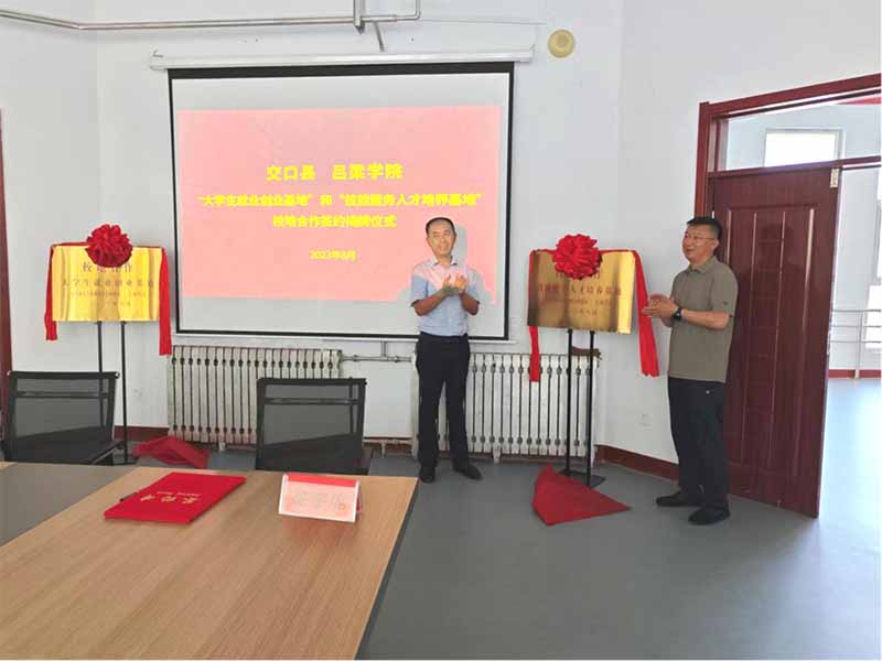 交口县委常委政府常务副县长王琳、Beat365唯一官方网站党委常委副院长王三虎共同为“技能服务人才培养基地”和“大学生就业创业基地”揭牌。