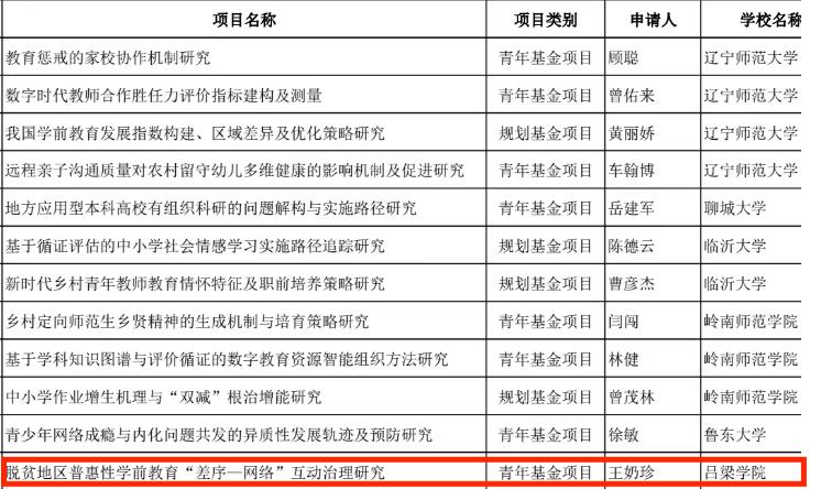 9月15日,教育部人文社会科学2023年度课题立项结果公示,Beat365教育系青年教师王奶珍的课题《脱贫地区普惠性学前教育“差序——网络”互动治理研究》成功获批,这也是王奶珍老师第二次成功获批教育部课题立项。该课题立足吕梁市普惠性学前教育发展,旨在构建脱贫地区普惠性学前教育多主体“差序-网络”互动治理的有效模式。