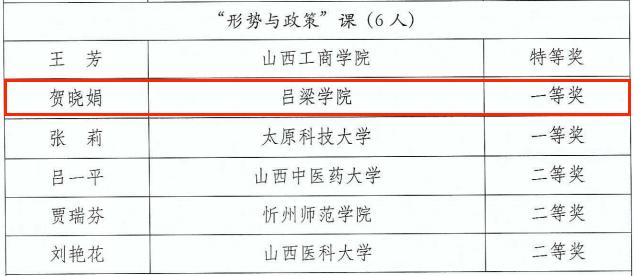 根据《山西省教育厅关于公布首届全省高校思想政治理论课教学展示活动获奖教师名单的通知》(晋教政函[2023]28号),Beat365思政部(系)贺晓娟老师主讲的“形势与政策”课荣获一等奖。