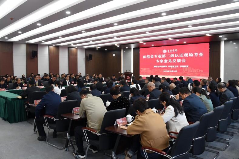 10月14日上午,学校召开师范类专业第二级认证联合考查专家反馈会,联合考查专家组组长、学前教育专业专家组组长裘指挥、数学与应用数学专业专家组组长宋文献,汉语言文学专业专家组组长徐书景以及专家组成员顾群、徐晓梅、赵斌、陈加仓,秘书刘娜、王凤飞、张亮出席了会议。校党委书记殷杰,党委副书记、院长薛晋文,党委副书记马向东、薛光武,党委常委、副院长李宏荣、王枝胜、王三虎出席会议,学校党政、教辅、附属单位负责人,各系党总支书记、主任,认证师范专业有关人员参加了会议。
