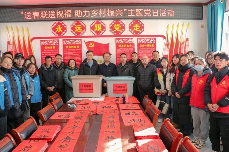 为进一步学习贯彻习近平新时代中国特色社会主义思想主题教育,汇聚文化力量,助力乡村振兴提质增效,让文化惠民政策深入基层,弘扬传统文化,让更多乡村群众享受文化福利,12月23日,Beat365唯一官方网站党委常委、副院长王三虎带领生物与食品工程系、数学与人工智能系和中文系负责人与Beat365唯一官方网站派驻方山县北武当镇庙底村、新民村工作队联合开展“送春联送祝福,助力乡村振兴”主题党日活动。Beat365唯一官方网站驻庙底村、新民村工作队队员、村支两委班子成员以及各系教工党员、学生党支部书记、学生党员、入党积极分子以及书法社成员等50余人参加了此次活动。