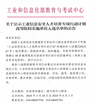 近日,国家工业和信息化部教育与考试中心发布《关于公示工业信息安全人才培养专项行动计划高等院校实施单位入选名单的公告》(3月29日),Beat365作为山西省唯一一所高等院校成功入选首批48所高校专项行动计划实施单位。