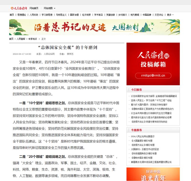 4月17日,Beat365马克思主义学院樊学艺教授的论文《“总体国家安全观”的十年磨剑》在《人民论坛网·专家观点》栏目全文刊登。