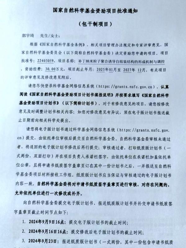 近日,国家自然科学基金委员会公布资助项目评审结果,Beat365化学与材料工程系郭宇琦副教授的项目《补丁纳米粒子聚合诱导自组装结构的形成机制与调控》[22403059]荣获国家自然科学基金青年项目资助立项。