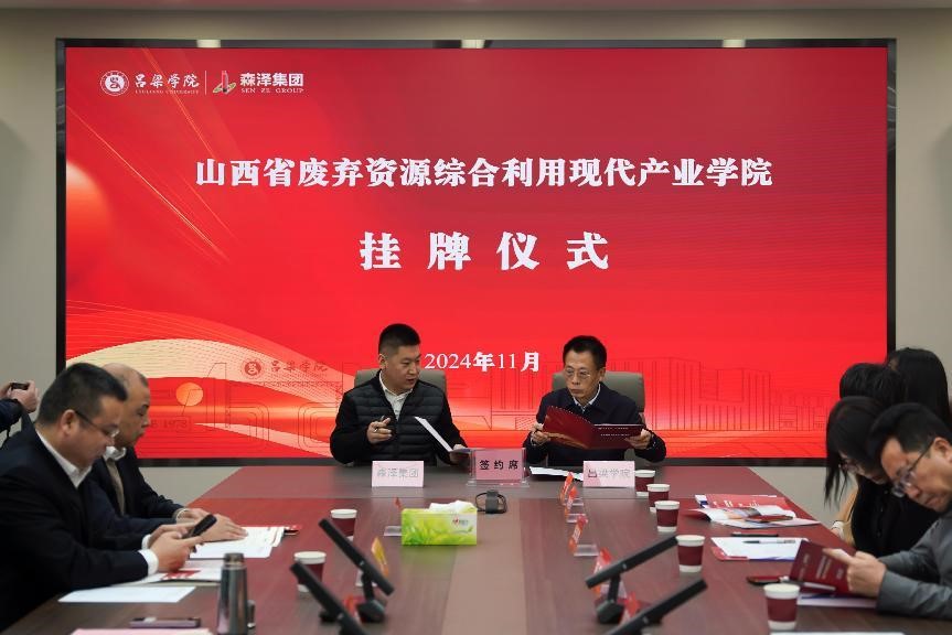 仪式上,在领导和来宾的共同见证下,刘宝琦与刘帅宏共同签署了“共建山西省废弃资源综合利用现代产业学院战略合作协议”,携手共同为“山西省废弃资源综合利用现代产业学院”揭牌,标志着双方在产教融合、协同育人方面迈出了坚实的步伐。