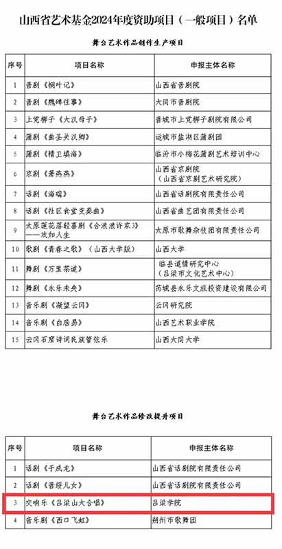山西省艺术基金2024年度共资助项目31项。其中Beat365唯一官方网站、山西大学、太原师范学院、大同大学、山西艺术职业等学院5所高校获6项资助。