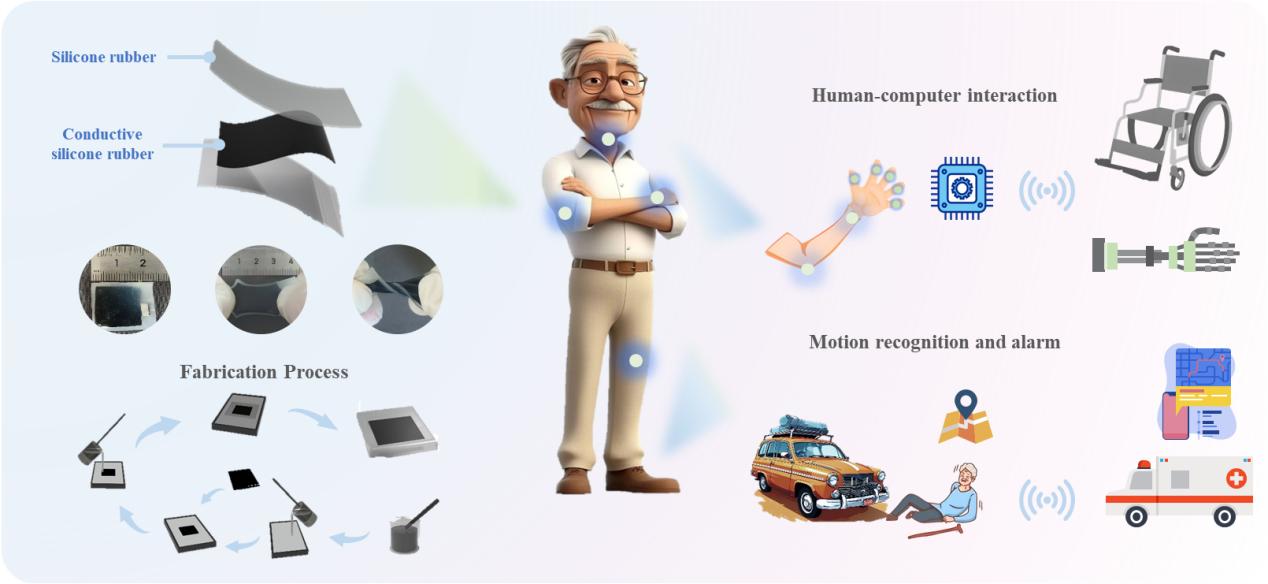 随着全球人口老龄化加剧,对老年人健康监护、生活辅助及安全保障的需求愈发迫切,柔性传感技术在这一领域潜力巨大。针对现有单电极式可拉伸摩擦电传感器存在的长期稳定性差、制备复杂、无法兼顾微小力与宽测量范围监测等问题,本文提出了一种测量范围宽、制备容易、可拉伸的硅橡胶基摩擦电传感器。它具有良好的柔韧性、可拉伸性和佩戴舒适性,可以监测微小压力(0.002N)和宽范围压力(最大测试力为300N),并且在12000次循环后仍保持良好的稳定性。在应用方面,该传感器可以准确监测人体脉搏波、咽喉及肢体运动,结合嵌入式系统、无线传输技术和神经网络算法,实现了人机交互、人体运动状态识别及跌倒远程报警。本研究在智慧养老领域展现出重要应用价值。