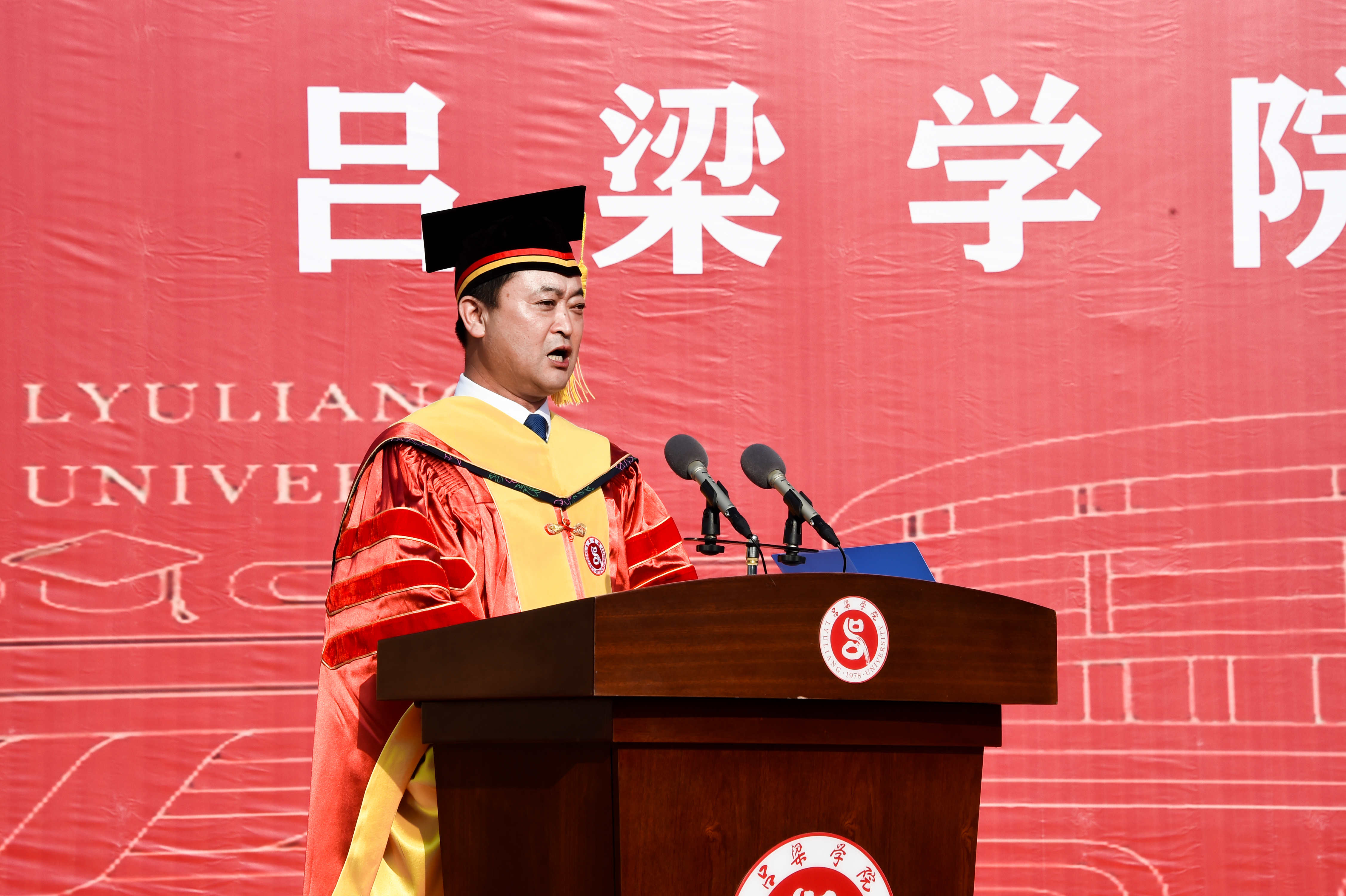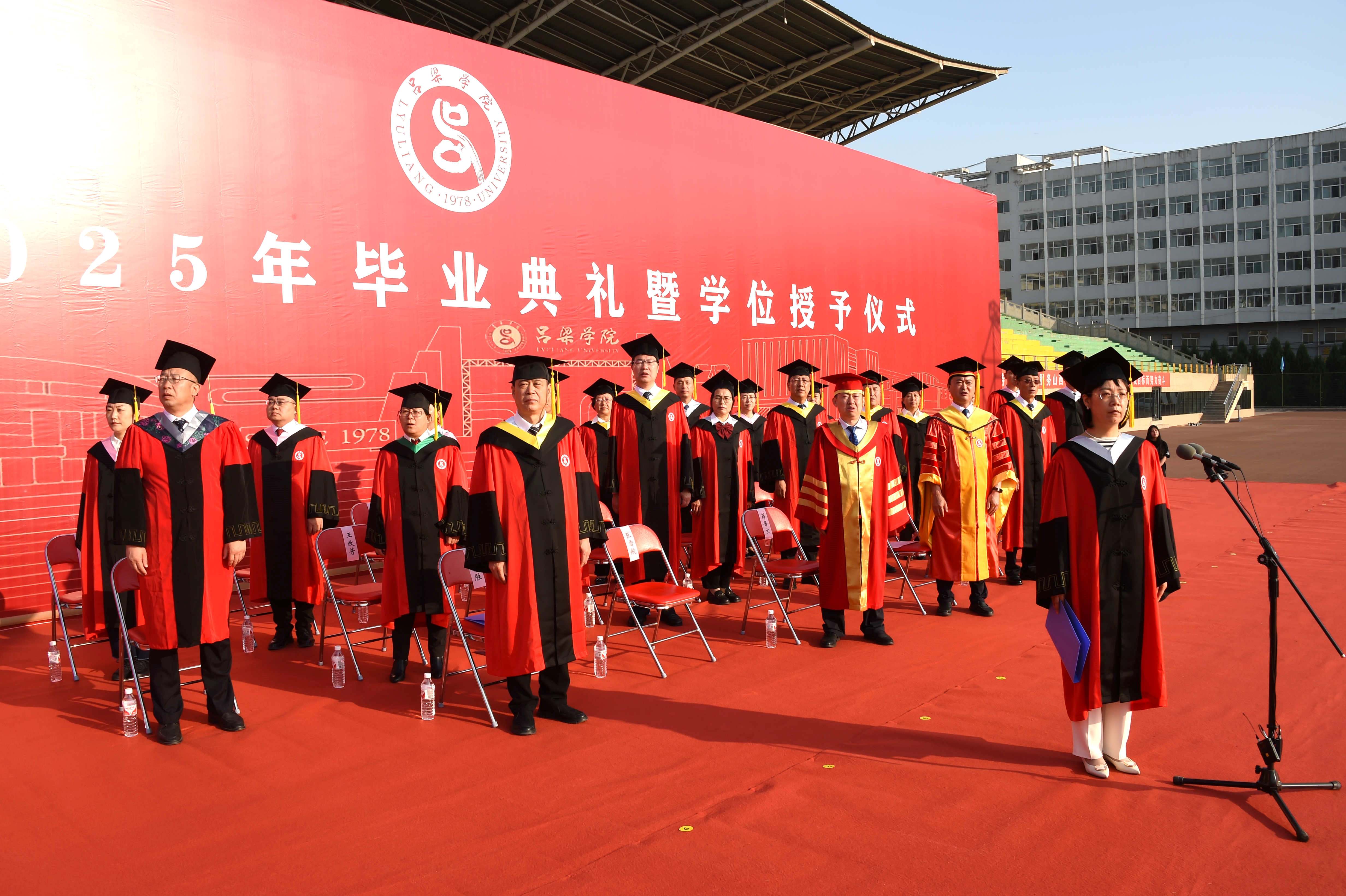 教师代表王奶珍对毕业生致以殷殷嘱托;毕业生代表卫晓晓表达对母校的感恩;家长代表乔育锋感谢学校对孩子的培养;校友代表辛高升为毕业生传授人生经验,祝福他们前程似锦,未来可期,祝愿母校桃李芬芳,再创辉煌;毕业生集体宣誓表示将“以弘毅立心、行知立行”,传承吕梁精神、赓续晋绥荣光,书写璀璨人生华章。