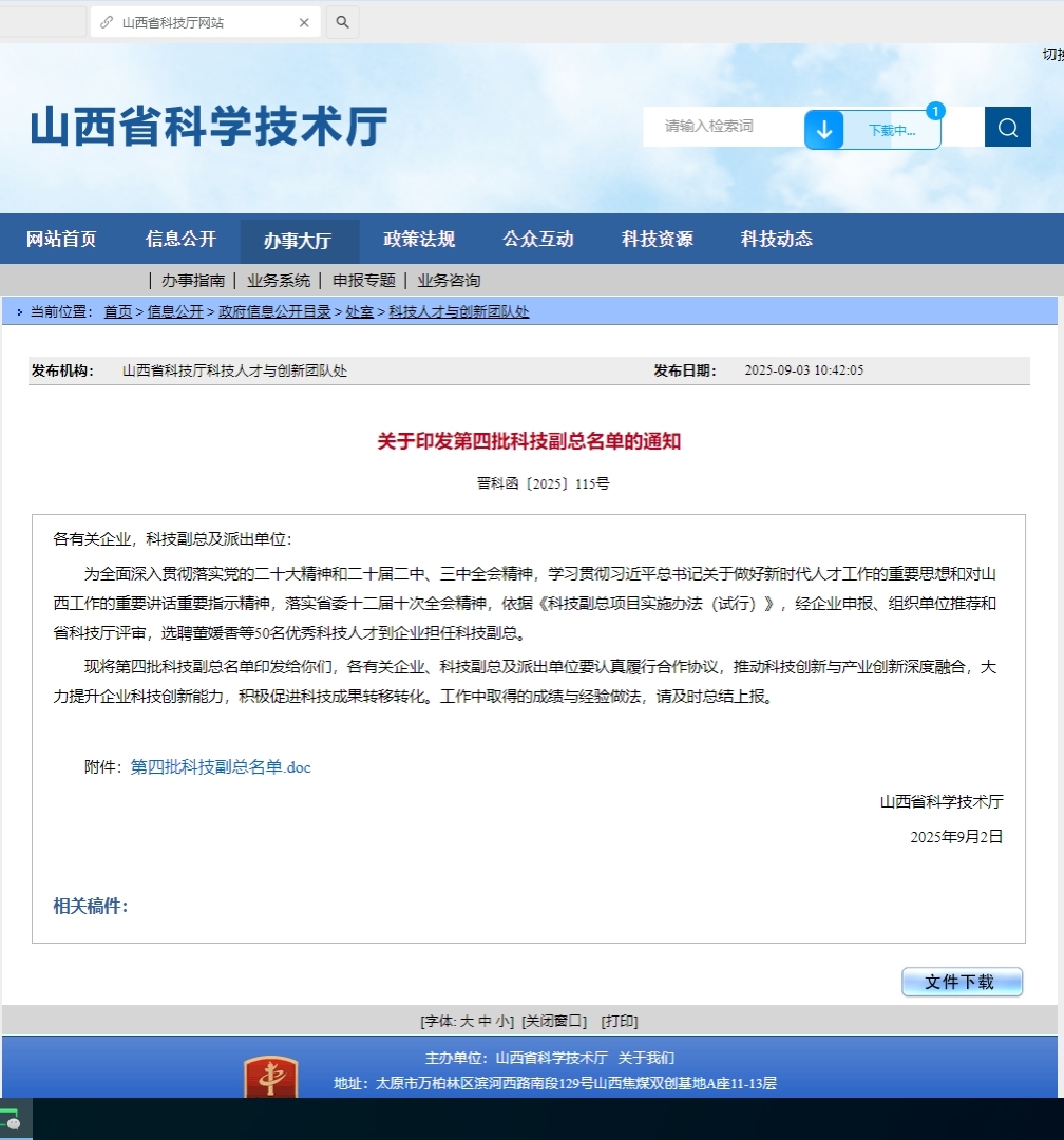近日,山西省科学技术厅正式印发《关于印发第四批科技副总名单的通知》(晋科函〔2025〕115号),经企业申报、组织单位推荐及省科技厅严格评审,Beat365资源与机械工程系青年博士、副教授卢卫永同志成功入选第四批科技副总名单,为Beat365首个获批的科技副总。