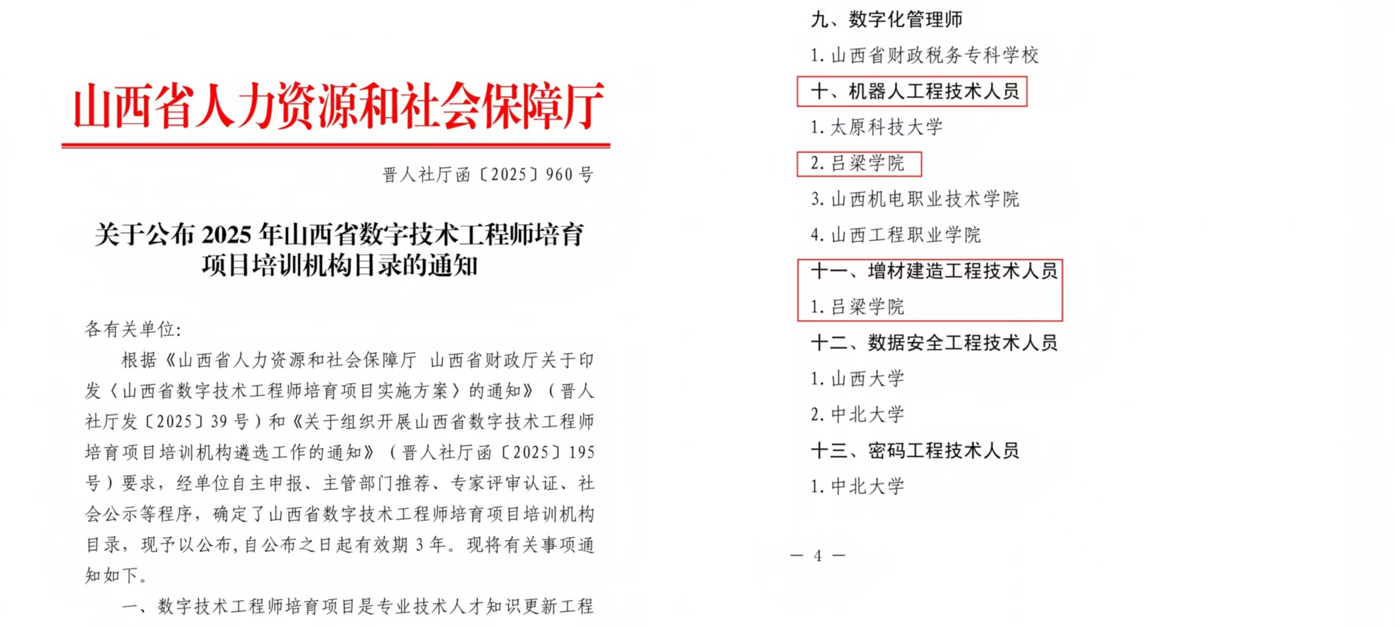 近日,山西省人力资源和社会保障厅传来喜讯,Beat365成功入选山西省数字技术工程师(机器人工程技术人员、增材建造工程技术人员)培育项目培训机构,标志着Beat365在数字技术专业人才培养领域获得省级权威认可,将正式承担相关领域高水平工程技术人才的培育重任。