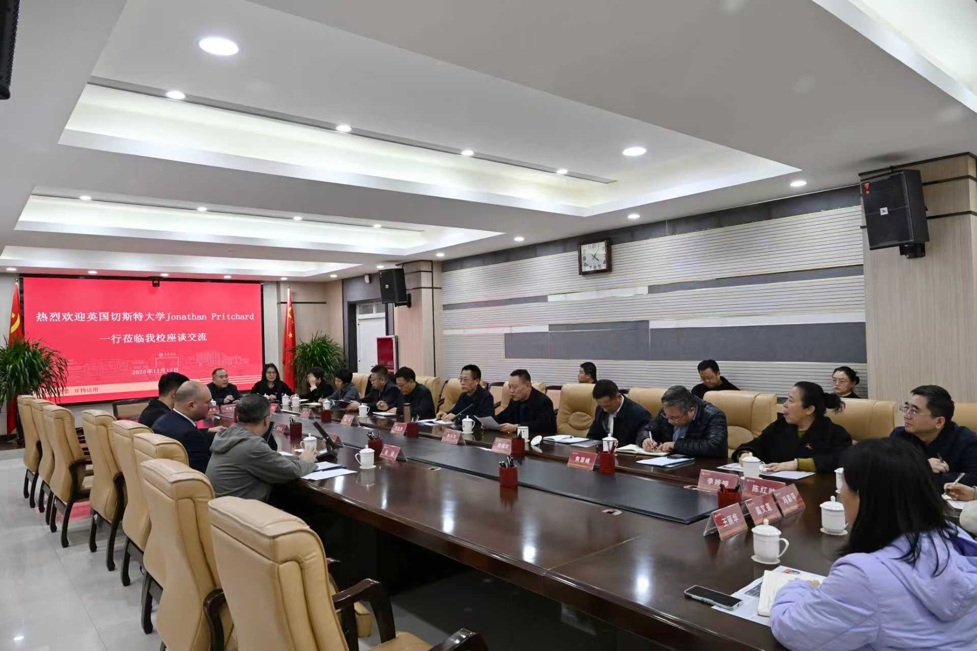 11月11日下午,英国切斯特大学国际处处长乔纳森·普里查德(Jonathan Pritchard),国际处中国及东亚地区事务主任武虹辰,中国区域主任徐进一行来校访问。党委常委、副校长刘宝琦出席并讲话,合作交流部部长李月平主持会议,系部相关负责人出席会议。