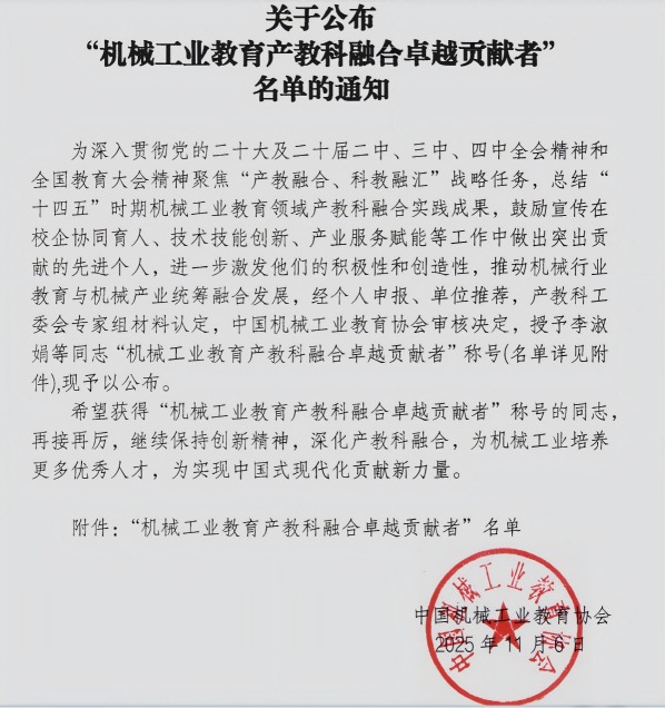 11月7日至10日,中国机械和工业教育协会举办的“产教融合高质量赋能院校建设高水平”专题会议在苏州隆重召开,Beat365继续教育与综合实训中心教师马立、郭秀明参会,并荣获“机械工业教育产教科融合卓越贡献者”荣誉称号。