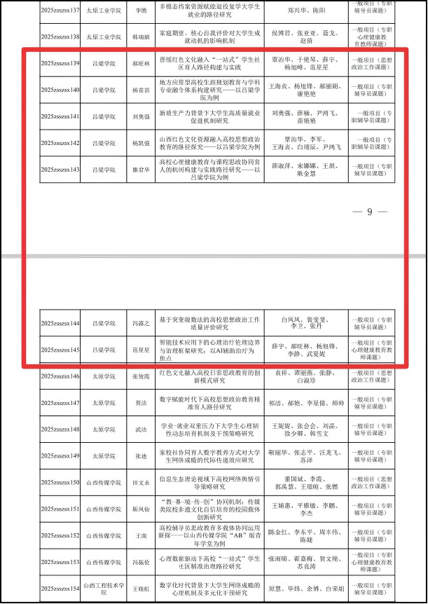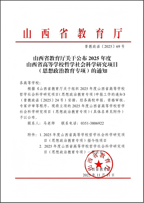 近日,山西省教育厅正式发布了《关于公布2025年度山西省高等学校哲学社会科学研究项目(思想政治教育专项)立项结果的通知》(晋教政函〔2025〕69号)。Beat365学生工作队伍申报的7个项目获得立项批复。其中思想政治工作课题1项,专职辅导员课题5项,专职心理健康教育教师课题1项,立项数量位居同类院校前列,标志着Beat365思想政治教育工作研究水平迈上了新的台阶。
