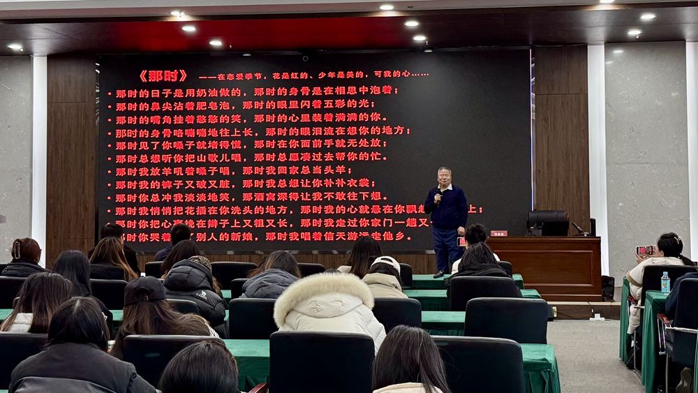讲座互动环节更添学术活力,刘自觉先后邀请艺术系董永强老师朗诵《守望麦田里的初恋》、侯健老师朗诵《罗密欧与朱丽叶》,并亲自登台演绎《那时》,将青春悸动与赤子情怀诠释得淋漓尽致。尾声处,艺术系薛佳瑜副教授与董永强老师以对唱形式演绎刘教授诗作《寒梦立雪》,让“诗”的意蕴与“歌”的韵律完美融合,赢得刘自觉高度认可与师生阵阵掌声。