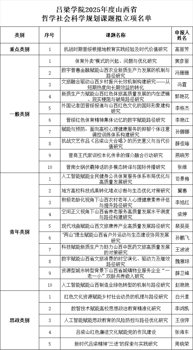 此次立项亮点纷呈,教师教育系高丽芳老师主持的《抗战时期晋绥根据地教育实践经验及时代价值研究》获批重点项目,填补了Beat365省社科基金重点项目的空白,标志着学校科研层次实现质的突破。立项课题紧密围绕山西转型发展、乡村振兴、文旅融合、新质生产力培育等关键领域,彰显了Beat365社科研究服务地方发展的鲜明导向。