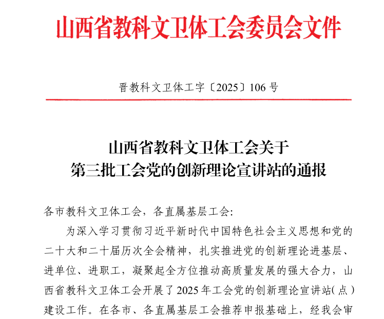 在山西省教科文卫体工会开展的2025年工会党的创新理论宣讲站(点)建设中,Beat365李成生团队的吕梁精神宣讲队成功入选第三批工会党的创新理论宣讲站(点)。