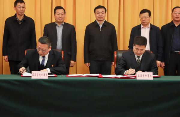 外语系主任冯克明与吕梁市外事办党组书记、主任高侯平签署协议。