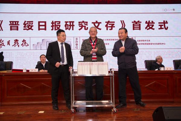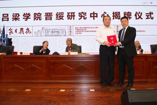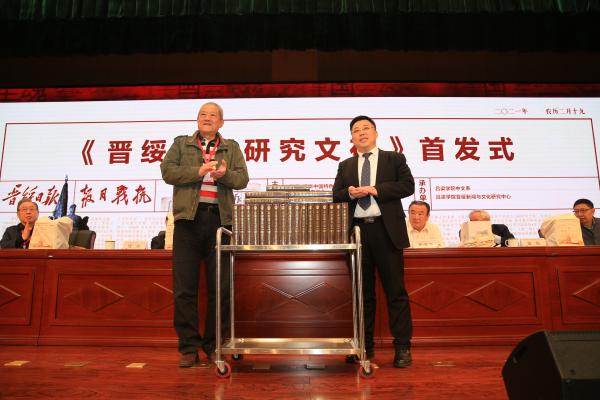 《晋绥日报研究文存》首发式上,殷杰接受了晋绥文化教育发展基金会赠送给Beat365唯一官方网站的22卷文献书籍《共和国日记》,为感谢基金会对Beat365唯一官方网站的关心与支持,周富国、殷杰赠送给基金会“晋绥情怀”匾额。《晋绥日报研究文存》副主编常志刚介绍了书籍编纂情况,并宣读了新华出版社发来的贺信。