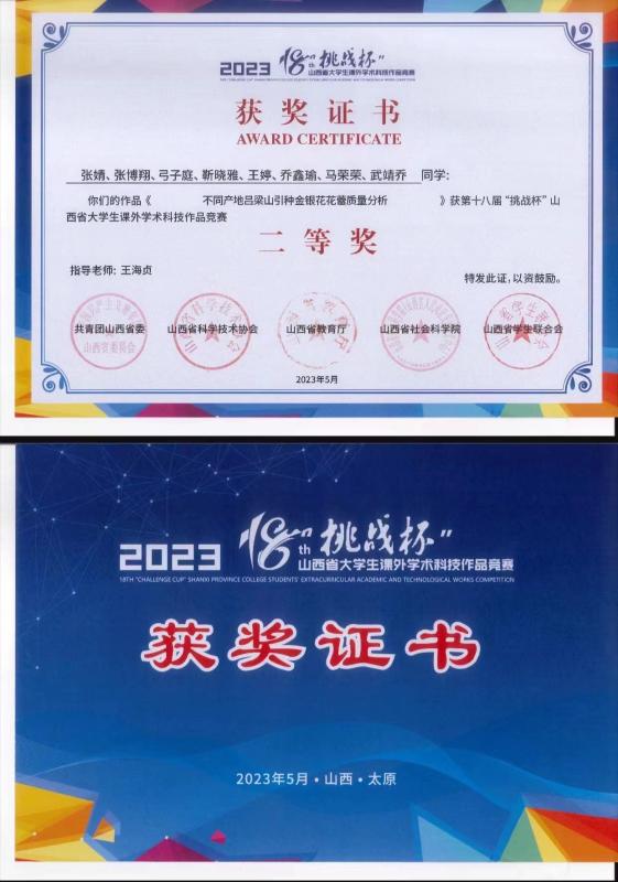 科创筑新梦,挑战正青春。由团省委、省教育厅、省科协、省社科院和省学联举办的第十八届“挑战杯”山西省大学生课外学术科技作品竞赛已圆满落幕。我系王海桢老师指导的《不同产地吕梁山引种金银花花蕾质量分析》荣获二等奖。