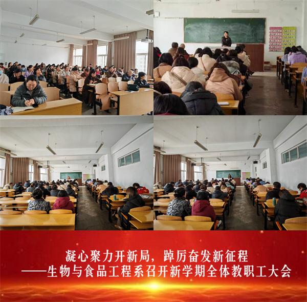征程万里风正劲,奋楫扬帆再出发。为全面做好新学期教育教学工作,确保系部各项工作开好局、起好步。2月28日,生物与食品工程系在弘毅楼301教室召开全体教职工大会,部署新学期各项重点工作,系领导班子成员及全体教职工参会,会议由党总支书记于艳琴主持。