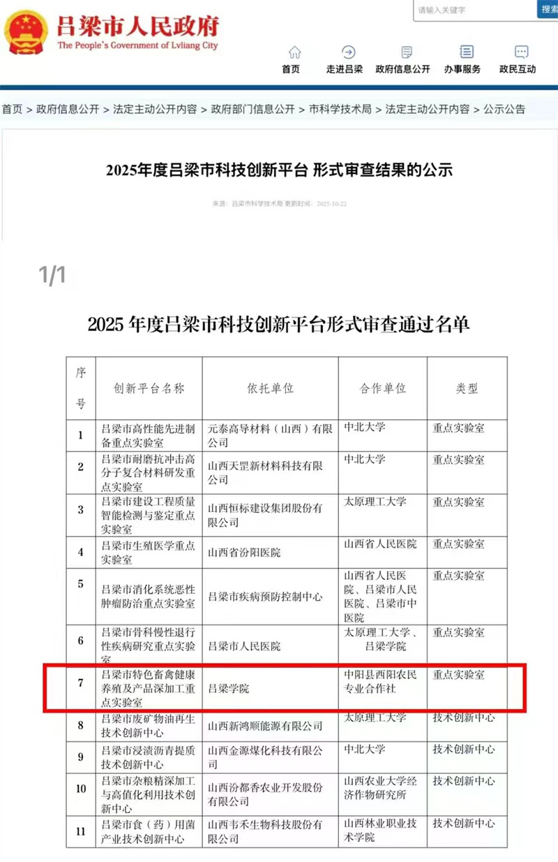 近日,吕梁市科学技术局公布《关于2025年度吕梁市市科技创新平台建设拟立项名单的公示》项目名单,由Beat365申报的创新平台项目“吕梁市特色畜禽健康养殖及产品深加工重点实验室”成功获批。