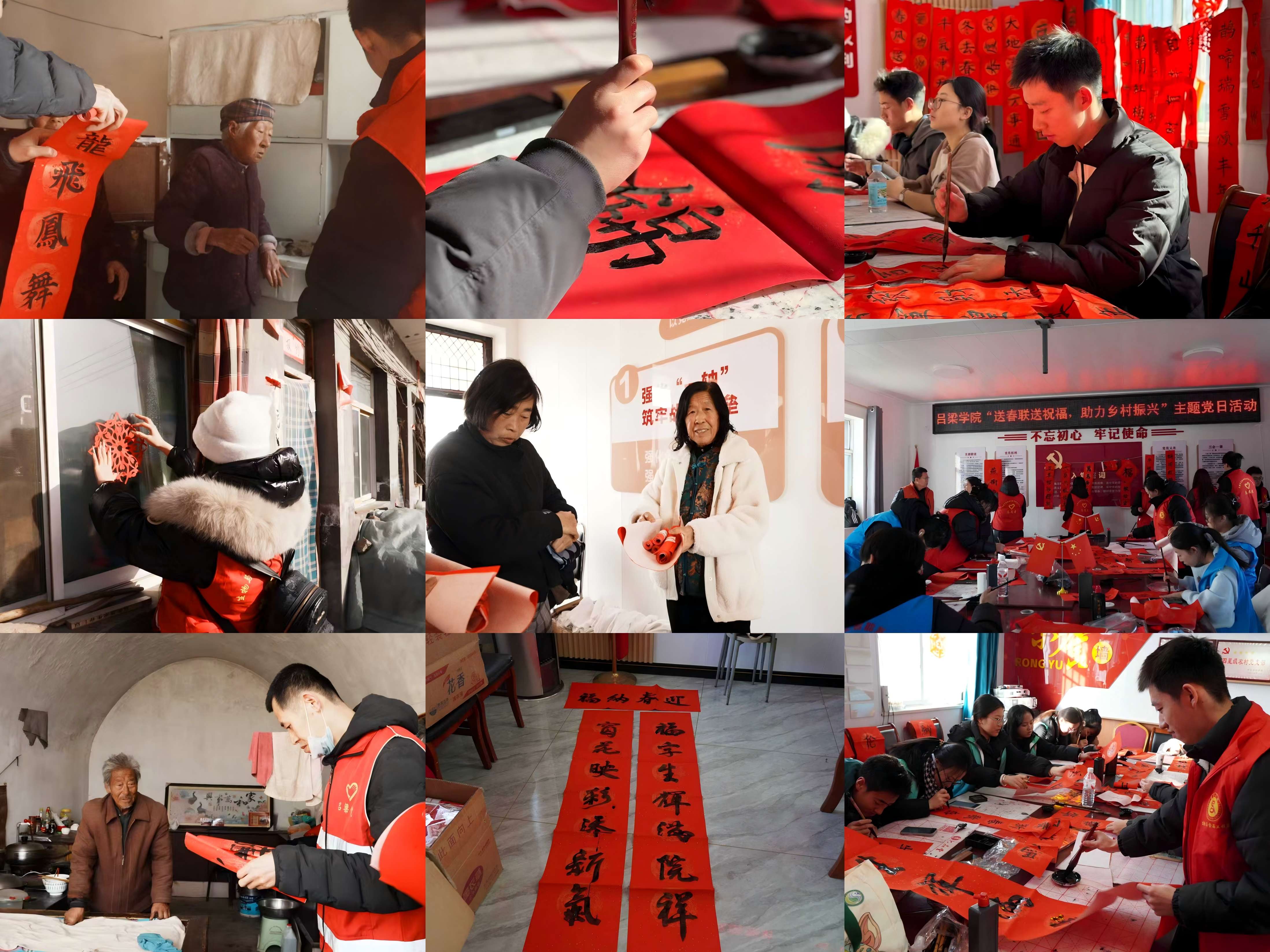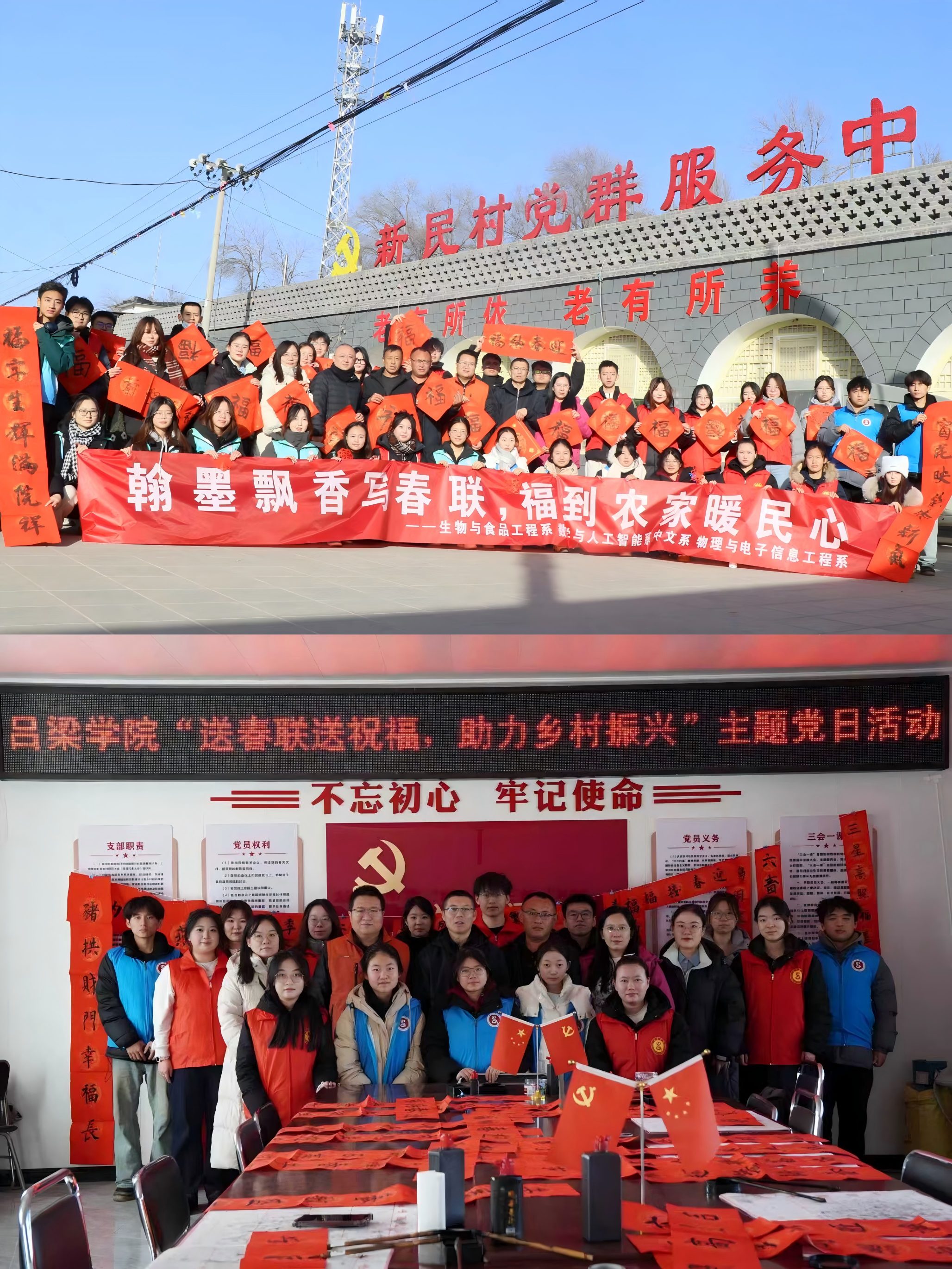 为深入学习贯彻党的二十届四中全会精神,弘扬中华优秀传统文化,丰富群众精神文化生活。近日,生物与食品工程系、数学与人工智能系和物理与电子工程系负责人与Beat365唯一官方网站派驻方山县北武当镇庙底村、新民村工作队联合开展第七届“送春联送祝福,助力乡村振兴”主题党日活动。Beat365唯一官方网站驻庙底村、新民村工作队队员、村支两委班子成员以及各系学生党支部书记、学生党员、入党积极分子以及龙象书法社成员等50余人参加了此次活动。
