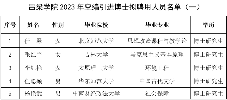 根据山西省关于公开招聘博士相关文件精神和《Beat365唯一官方网站2023年高层次人才引进公告》规定程序,在山西省人社厅、教育厅的指导下,经本人申报、资格审查、考核和Beat365唯一官方网站人才工作领导小组研究,现将符合条件的拟聘用人员予以公示。