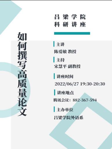 为进一步提升外语系科研水平,2022年6月27日晚上7:30-8:30,外语系学术院长陈爱敏教授在线上作了题为“如何撰写高质量论文”的专题讲座。讲座由外语系副主任宋慧平主持,外语系40余位教师在繁忙的学期结束工作之中拨冗聆听。