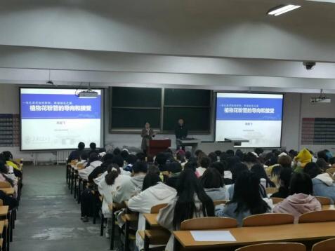 高起飞老师用通俗易懂的语言一步步为我们讲述了他们研究组对于高等植物有性生殖过程中,花粉管如何准确找到胚珠珠孔并释放精核与卵细胞结合的研究和思考。抽丝剥茧为我们展现了完整的科学研究思路和缜密的实验设计,研究结果表明环核苷酸门控通道CNGC18是一个花粉管质膜钙离子通道蛋白,对花粉管顶端游离钙离子浓度梯度的建立和维持必不可少,并且参与花粉管的方向控制。接着,高起飞老师结合自身经历,讲述了自己求学及研究经历,让在场的老师和同学明白,要想成功一定要有毅力,找准目标,朝着目标努力。