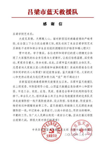 2月21日,Beat365唯一官方网站艺术系收到吕梁市蓝天救援队发来的一封感谢信,系领导打开信一看,才知道了事情的原委。原来是,早些时候的2月11日,该系音乐学专业部分师生自发向吕梁市疫情防控青年突击队——蓝天救援队捐赠了价值6000元的KF94口罩200只,音乐学专业教师柳铁平还代表大家专程前往暖心慰问了救援队员。